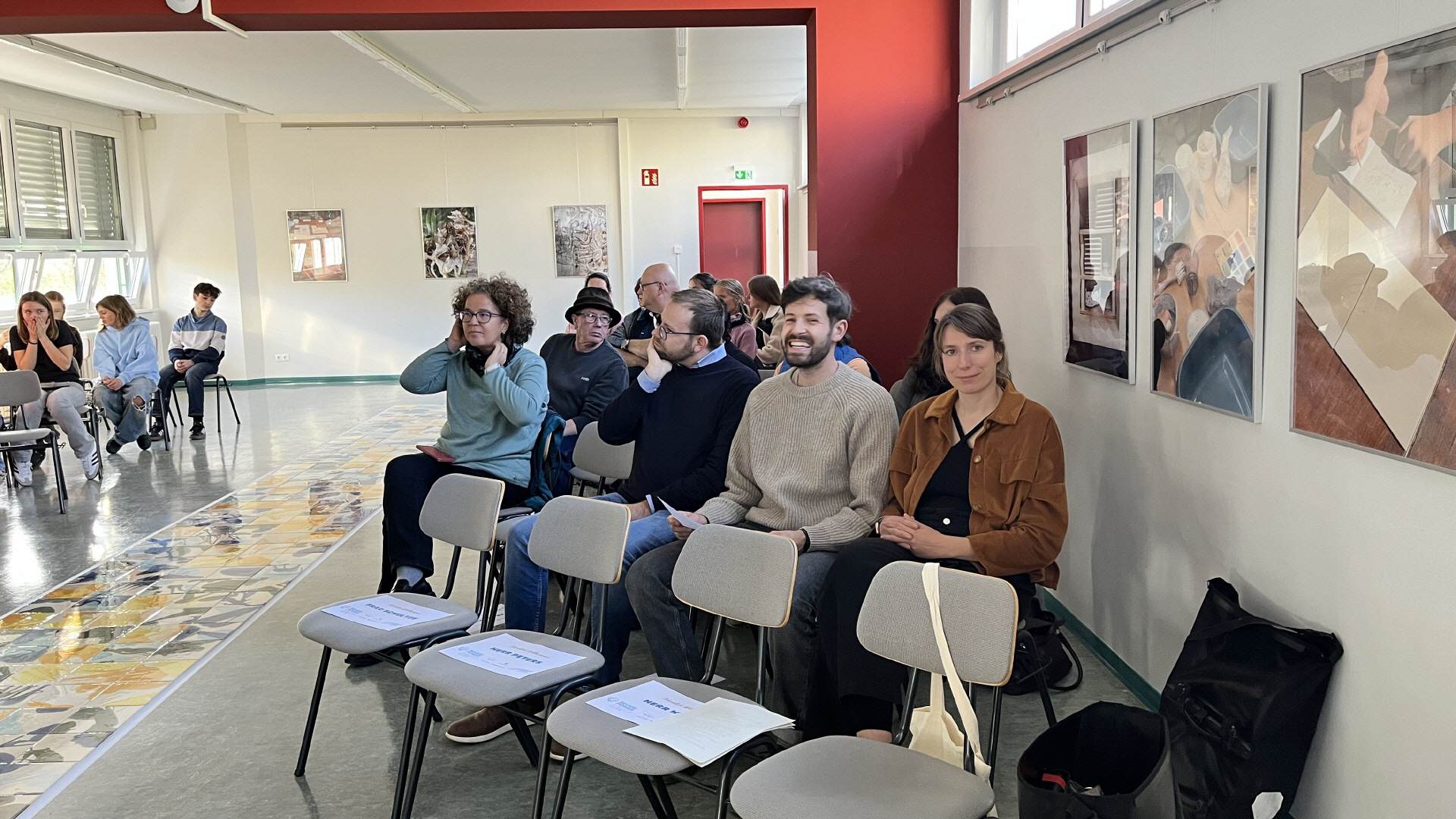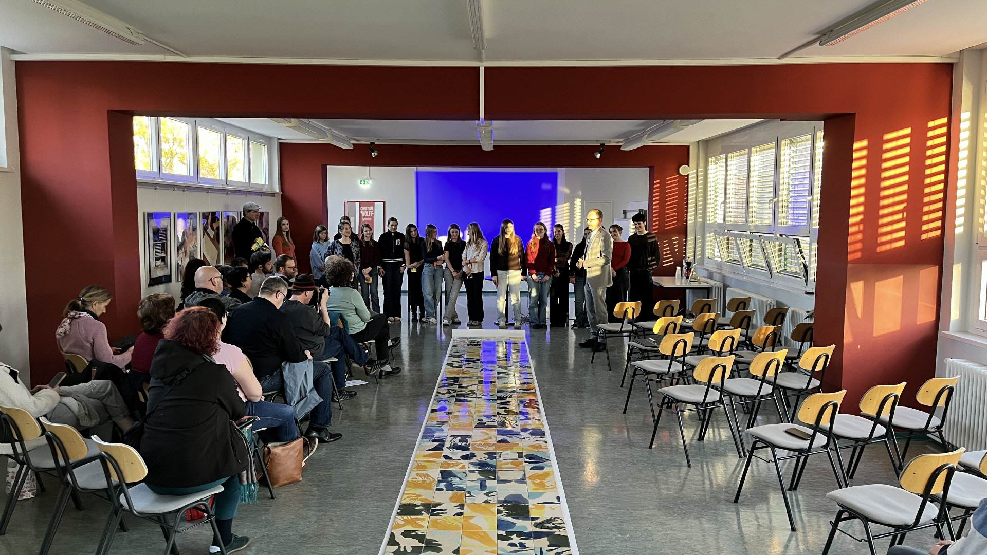 Im Mittelpunkt der Veranstaltung stand die offizielle Übergabe der über 300 im Rahmen der Kunstfahrt entstandenen Keramikfliesen an den Architekten Herrn Weber vom Büro Schmelzer und Weber. Nach einer herzlichen Begrüßung durch Frau Fuchs und einer sehr persönlichen Zusammenfassung der Kunstfahrt durch die Schülerinnen Hanna und Paula (Jahrgang 9) gab Herr Weber einen Einblick in den aktuellen Planungsstand des geplanten Erweiterungsbaus. Mithilfe eines 3D-Modells visualisierte er eindrucksvoll, an welcher Stelle das gemeinsame Wandbild später die Treppenhäuser des Neubaus prägen wird.