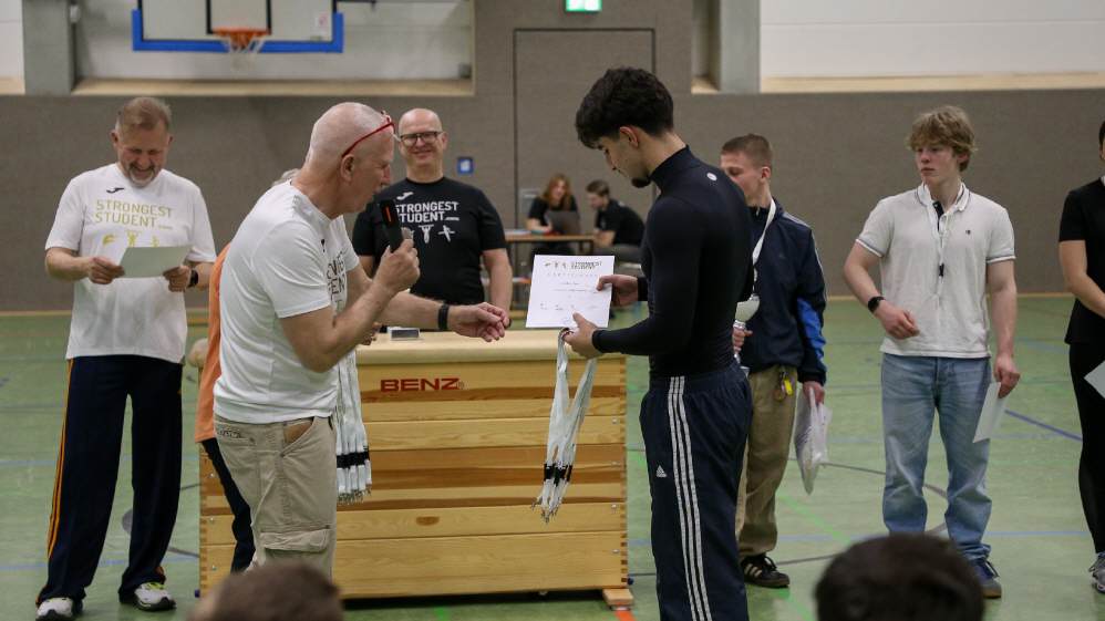 Am 4. März hat das Georg-Cantor-Gymnasium erneut die stärksten Schülerinnen und Schüler zum „Strongest Student Cantor Open Contest“ eingeladen. In diesem Wettbewerb treten die Schülerinnen und Schüler in drei Disziplinen sowohl als Team als auch im Einzelwettbewerb gegeneinander an. Ziel ist es, möglichst viele Klimmzüge und Beugestütz zu schaffen sowie aus dem Stand weiter als die Konkurrenz zu springen. Nachdem unsere Schule die Team-Wertung zwei Jahre in Folge gewonnen hatte, gab es dieses Jahr einen Ruf zu verteidigen. Der diesjährige Wettbewerb erreichte eine Rekordgröße mit 6 teilnehmenden Schulen. Für unsere Schule gingen Laura (9d), Miral (12), Khetag (10d) und Vladyslav (9b) als Team und Teddy (11) im Einzelwettbewerb an den Start. Die Reihenfolge der Teams wurde ausgelost und wir durften als erste Schule zeigen, was wir können. Nachdem unser Team die Stationen durchlaufen hatte, stand fest, dass wir 1177 Punkte erreicht haben. Damit lagen wir etwas unter dem Ergebnis des Vorjahres, aber unsere Hoffnungen waren immer noch hoch, wie die Schülerinnen und Schüler in einem kurzen Interview dem MDR bekannt gaben. Nachdem alle Teams die Stationen durchlaufen hatten, war noch Teddy an der Reihe um sich als Einzelstarter zu beweisen. Er erreichte starke 372 Punkte.