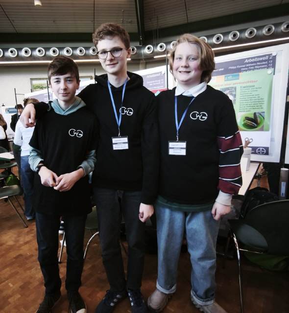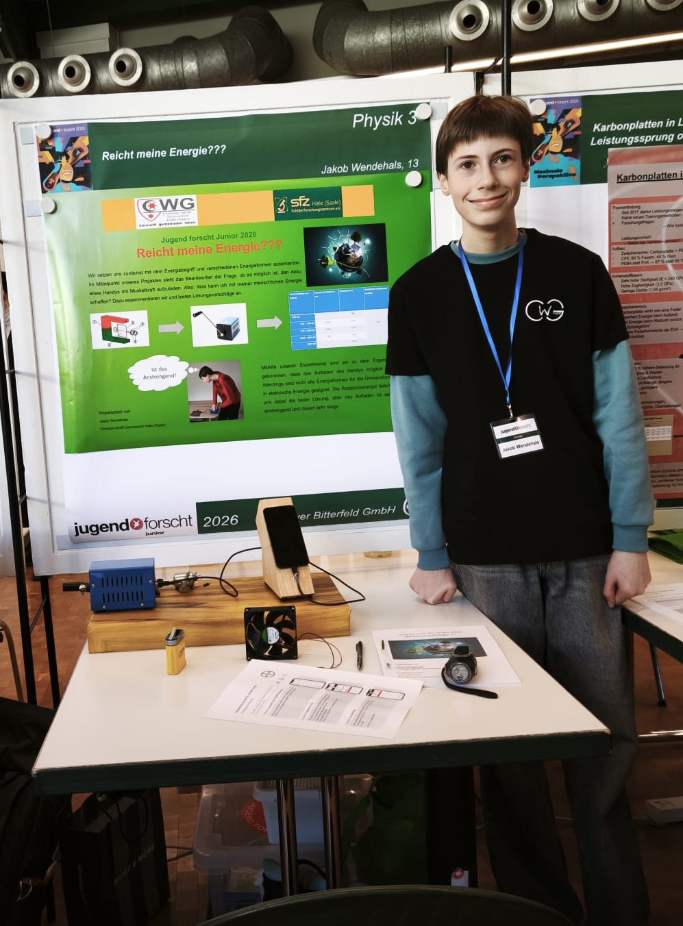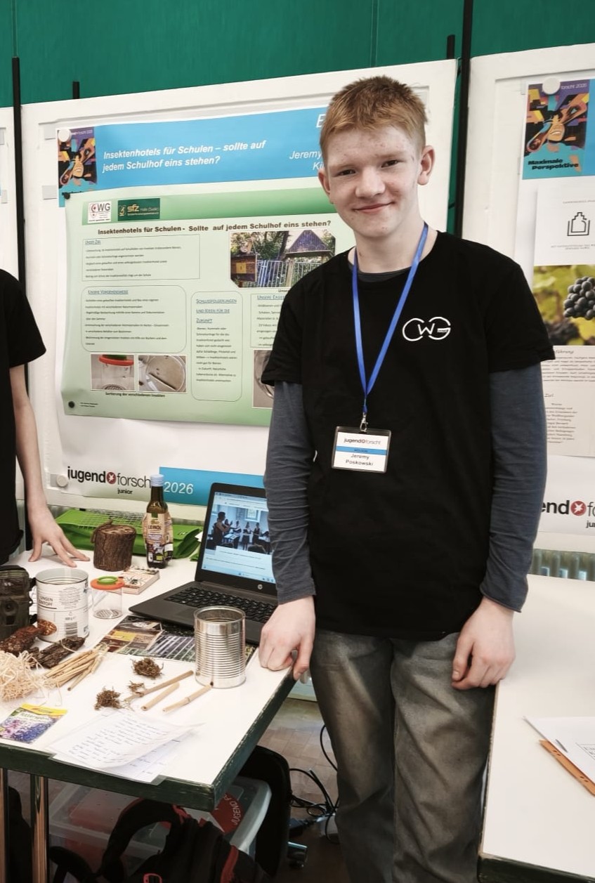 Nach langen Vorbereitungen war es wieder so weit - der Regionalwettbewerb in Greppin fand am 5. März 2026 statt. 35 Projekte mit fast 50 Teilnehmerinnen und Teilnehmern aus dem Süden Sachsen-Anhalt versammelten sich auf dem Firmengelände von Bayer. Die Projekte präsentierten in den Welten Biologie, Physik, Arbeitswelt, Informatik/Mathematik, Technik, Geo-/Raumwissenschaften und Chemie unter dem Motto „Maximale Perspektive“. Mit dabei waren sechs Schüler vom CWG. Kilian (8a) und Jeremy (8d) präsentierten das Projekt „Insektenhotels für Schulen - Sollte auf jedem Schulhof eins stehen?“ in der Themenwelt Biologie. Philip, Immo und Karlo (7c) aus unserer Schule waren mit ihrem Projekt „Mikroben: unsichtbar, aber unverzichtbar“ dabei. Jakob (7b) stellte sein Projekt „Reicht meine Energie???“ in der Themenwelt Physik vor. Es waren viele weitere Schulen vertreten wie z. B. das Georg-Cantor-Gymnasium oder das Elisabeth Gymnasium aus Halle. An Verpflegung war natürlich auch gedacht. Es gab Pizza, belegte Brötchen, Kuchen, Nudeln mit Tomatensoße und Getränke. Nach einer kurzen Rundführung auf dem Firmengelände von Bayer fand die Preisverleihung statt. Philip, Immo und Karlo belegten den dritten Platz Kilian und Jeremy und Jeremy in ihrem Themengebiet den zweiten, wofür sie neben einem kleinen Preisgeld auch einen Bücher-Sonderpreis erhielten. Jakob belegte den ersten Platz und qualifizierte sich dadurch für Landeswettbewerb.