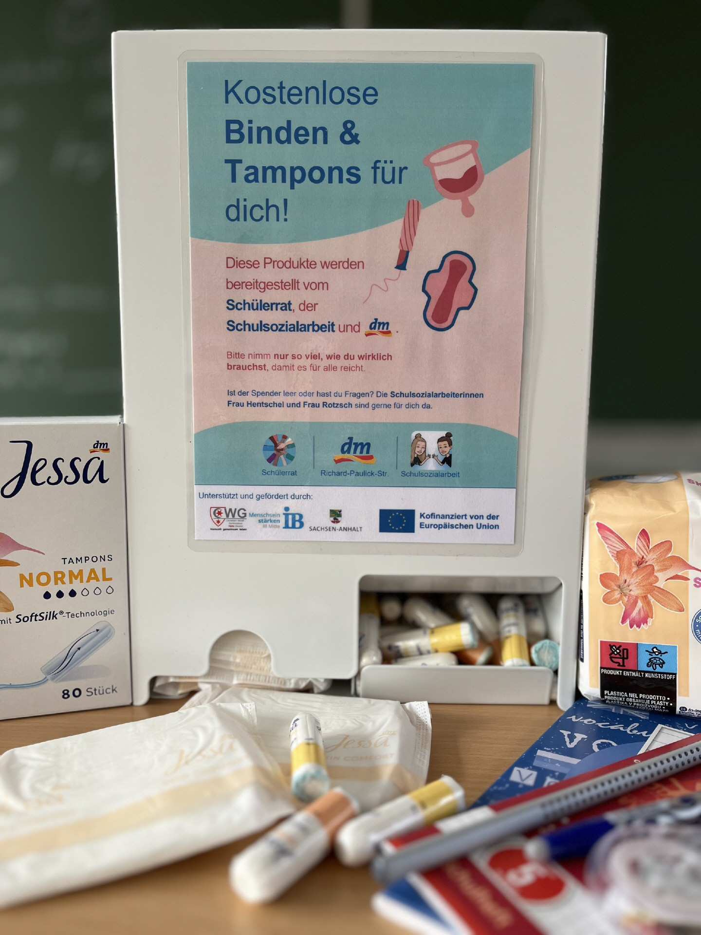 Dabei handelt es sich um ein wertvolles Projekt, welches von unserem engagierten Schülerrat in Zusammenarbeit mit dem Drogeriemarkt dm in der Richard-Paulick-Straße initiiert wurde und mittlerweile von den Schulsozialarbeiterinnen unterstützt wird. Diese haben die Spender organisiert und befüllen sie gemeinsam mit dem Schülerrat. Der Schülerrat holt die Hygieneartikel von dm ab. Ein ganz besonderer Dank gilt dm, von dem die benötigten Binden und Tampons kostenfrei zur Verfügung gestellt werden.