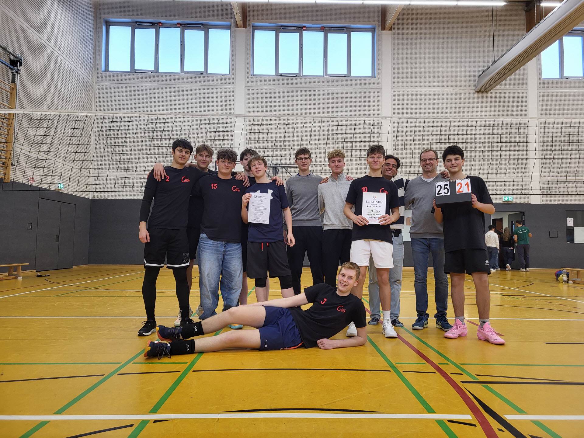Dort warteten am 16.12.2025 die vier Sieger der anderen südlichen Landkreise. Leider konnte unser Team nur mit sieben Spielern antreten, davon einige durch gerade abgeklungene Erkrankungen zudem noch angeschlagen. Das Los wollte es so, das Turnier startete mit dem vorweggenommenen Finale unserer Equipe gegen das Wolterstorff-Gymnasium Ballenstedt, ein mit Landesauswahlkadern bestücktes, hervorragend ausgebildetes Team. Im ersten Satz knüpfte unsere Mannschaft nahtlos ans Stadtfinale an und schockte den Favoriten mit starken Angriffen, exzellenten Blocks und einer wiederum sehr guten Abwehrleistung. Unser CWG siegte 25:21 und hatte im zweiten Satz die Chance, das Spiel zuzumachen. Nach großem Kampf wurde 23:25 verloren. Ballenstedt spielte sich nunmehr in einen Rausch und im Tiebreak waren wir chancenlos (4:15). Die anderen drei Spiele gewann unser Team souverän, aber Ballenstedt natürlich auch. So blieben der nur auf den ersten Blick undankbare 2. Platz und das Ausscheiden vor dem zum Greifen nahen Landesfinale. Am Ende aber überwiegt bei den Trainern großer Stolz auf die Mannschaft, die in vier Monaten nicht nur das Läufer-System mit einem Zuspieler erlernt, sondern unter Wettkampfbedingungen erfolgreich umgesetzt hat und sich vor allem mit ihrer Mentalität nicht hinter den Vorgängern verstecken braucht.